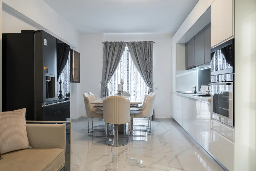 La primul nivel (etaj 6) te întâmpină un hol primitor de 3.40 mp, care se deschide spre un living spațios de 17.60 mp – inima casei, locul ideal pentru seri petrecute în familie sau cu prietenii. Bucătăria este deschisă, complet mobilată și utilată (inclusiv electrocasnice Samsung și LG), integrându-se armonios în spațiul de zi. Tot aici se află un grup sanitar de 3.90 mp și un balcon deschis de 5.5 mp, perfect pentru cafeaua de dimineață.