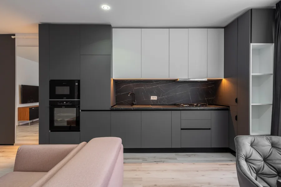 • Living + Bucătărie open-space: Cu o suprafață de 32,7 mp, această zonă centrală a apartamentului este ideală pentru a petrece timp de calitate alături de familie și prieteni. Bucătăria este complet utilată și mobilată cu electrocasnice de top (cuptor microunde, cuptor electric, plită și hotă Gorenje, mașină de spălat vase Beko) și o chiuvetă din granit Pyramis, iar livingul spațios este perfect pentru relaxare, cu un TV Samsung LG pentru momentele de divertisment.