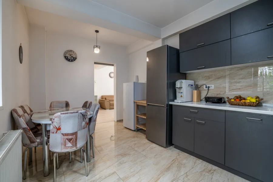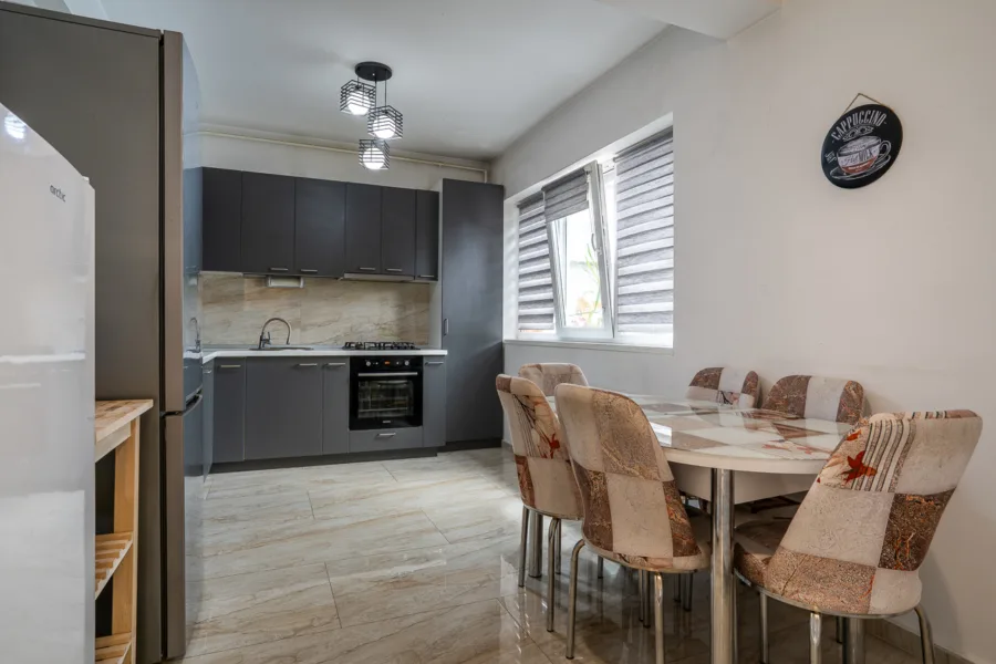 Bucătăria este separată – un loc care inspiră gătitul cu dragoste, spațioasă și bine dotată, iar accesul direct către curtea amenajată cu pergolă îți oferă libertatea de a transforma diminețile de vară în ritualuri de cafea în aer liber.