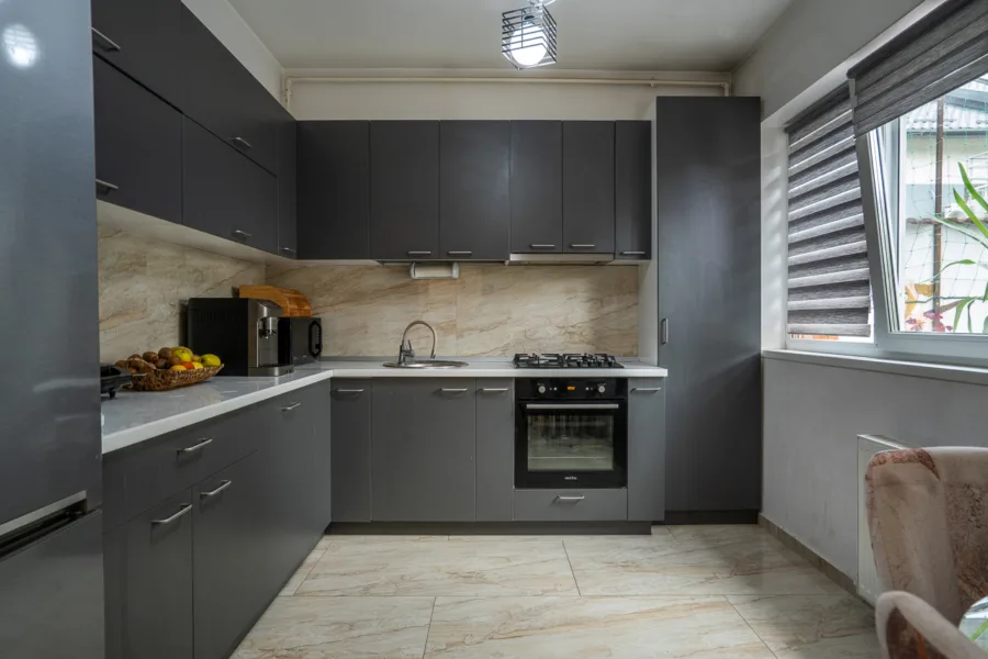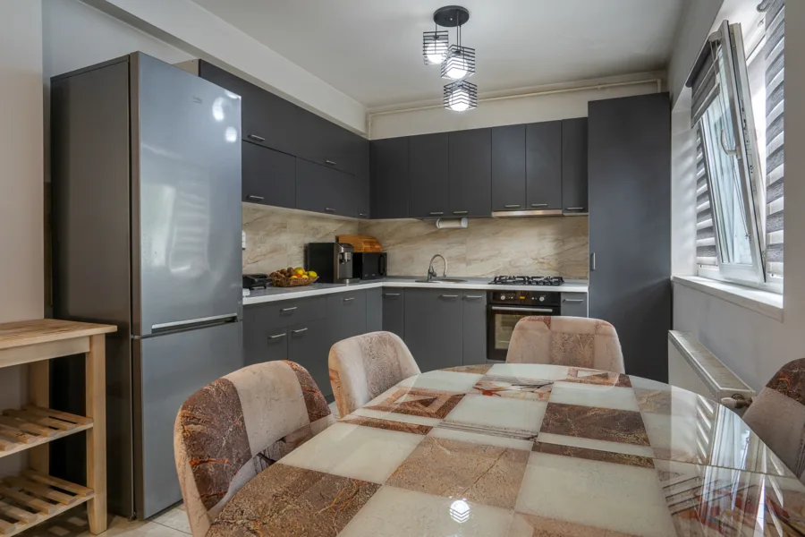 Bucătărie separată dotată cu ușa din sticlă culisantă (14.74 mp) complet mobilată cu mobilier MDF și electrocasnice (frigider Beko, congelator Arctic, plită gaz Beko, cuptor electric Arctic, cuptor microunde Samsung)