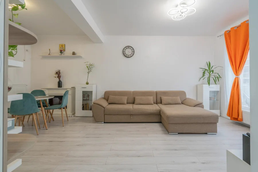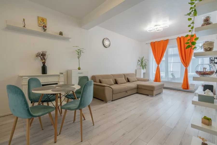 Living luminos și spațios (22.52 mp) cu șemineu electric, canapea confortabilă, televizor LED și zone de relaxare
