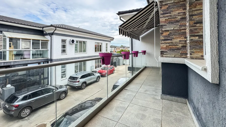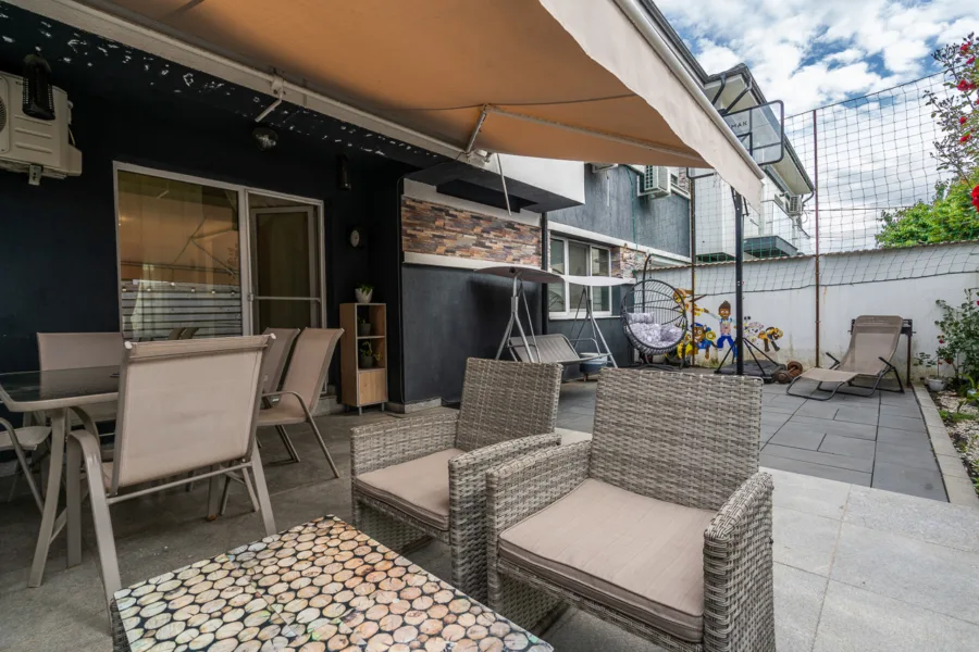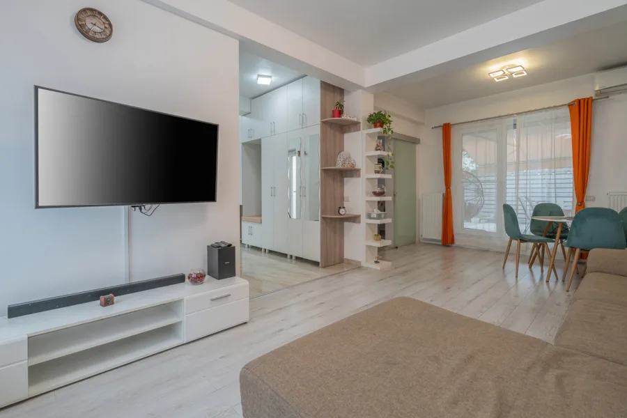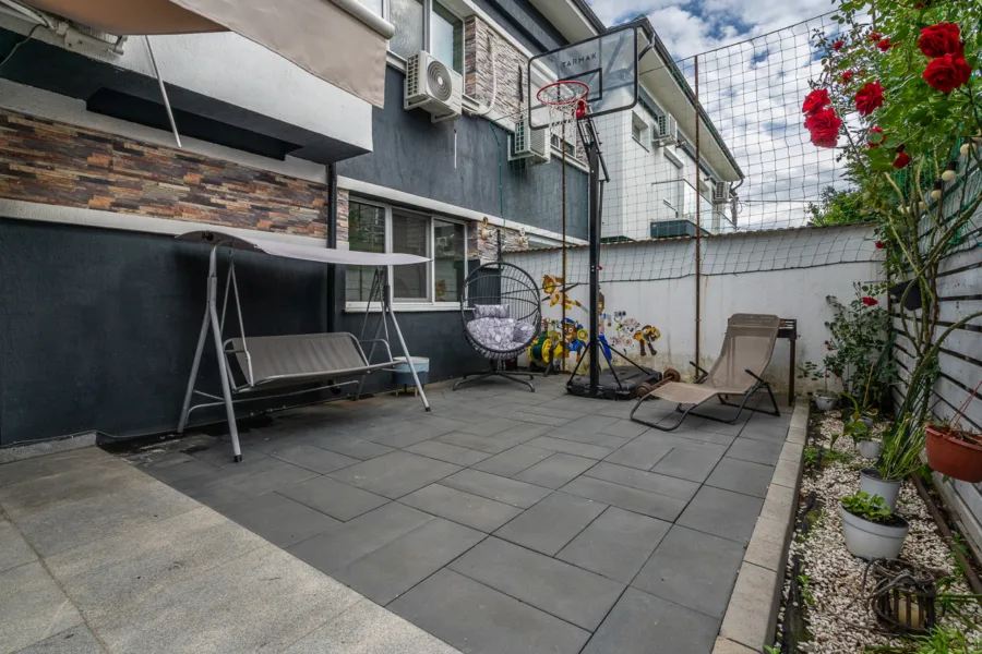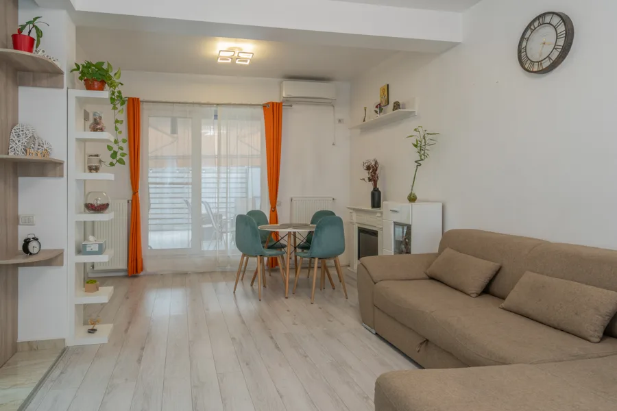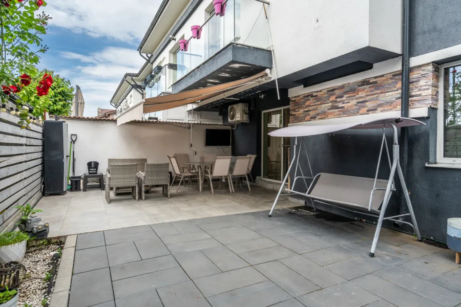 Acces către curtea exterioară de 55 mp cu pergolă retractabilă – spațiu ideal pentru grătar, relaxare sau timp petrecut cu familia