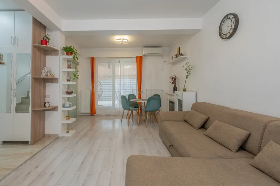 Imobilul este parțial lipit (cu un spațiu tehnic de 20 cm între pereți și separare prin termosistem), ceea ce îi conferă intimitate acustică sporită și eficiență termică. Are o suprafață totală de 112 mp,din care suprafață utilă de 96.91 mp, plus o curte amenajată de 55 mp și 2 locuri de parcare în proprietate.
