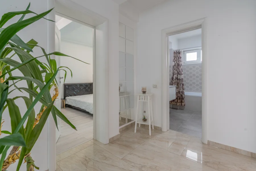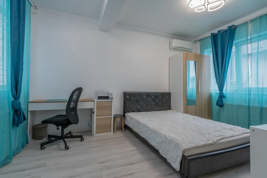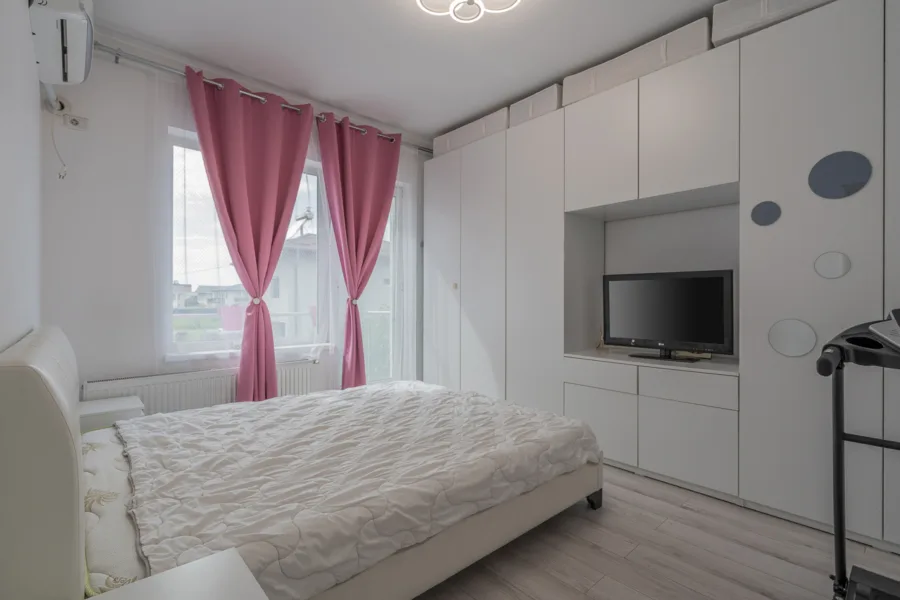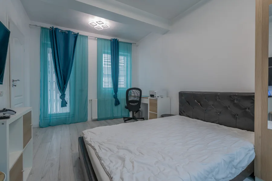 Finisaje și dotări interioare: parchet laminat 10 mm, gresie porțelanată Italia, ferestre cu geam tripan, uși celulare, iluminat LED, 3 aparate de aer condiționat Grundig 18.000 BTU, centrală termică pe gaz Ferroli 24 kW.